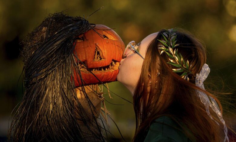 فتاة تتظاهر أمام صديقتها بتقبيل قرع في مهرجان ويست سايد هالو، أكبر مهرجان هالوين في البلاد، في رومانيا. غواصون يشاهدون متزلجًا على الماء يرتدي زيًا تنكريًا خلال مسابقة السحرة والسحرة السنوية في خليج مورو، كاليفورنيا.