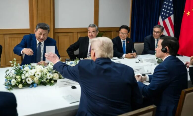ففي غرفة مليئة بالدبلوماسيين ذوي البدلات الرسمية، ظهر ترامب في إحدى الصور ممددا ذراعه على طاولة المفاوضات ليُري شي ورقة، ولا يزال محتوى الورقة مجهولًا.