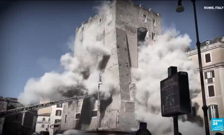 وتثير جماعات حفظ التراث في إيطاليا الانذار – ويقال إن نحو ٤٥٠ موقعا تاريخيا معرضة للخطر بسبب العمر وعدم كفاية تمويل الصيانة. قبل أيام فقط، برج في القرن الثالث عشر انهار في وسط روما، مما أدى إلى مقتل شخص واحد وإصابة ثلاثة آخرين بجروح خطيرة. وقد جددت هذه المأساة نداءات للحصول على الدعم من القطاع الخاص والاتحاد الأوروبي. هذا التقرير من قناة (فرنسا) الأخت (الخاصة بـ(نيك روشورث.