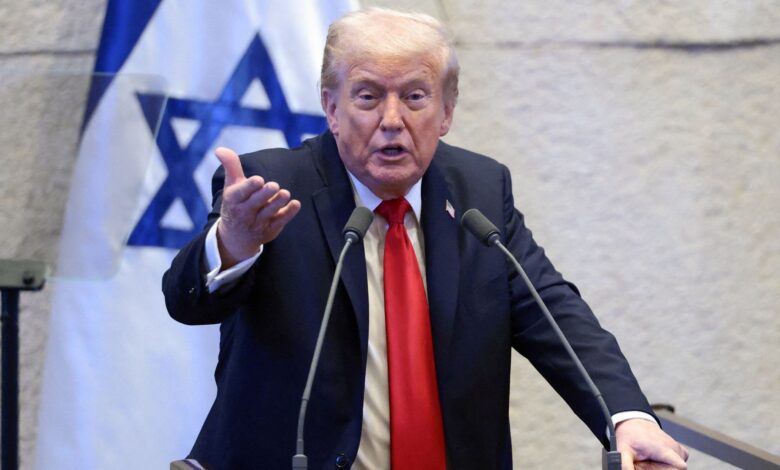 دونالد ترامب) كان مكتئباً) من قبل السياسيين اليساريين بينما أخبر برلمان إسرائيل أن صفقة السلام في غزة