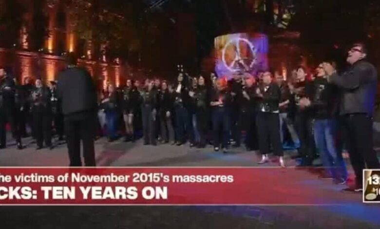 جوقة الناجين تغني “ريفال سونز” عام 2015 حفل الاحتفال بهجمات باريس
