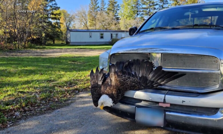 في حادثة غير معتادة، علق نسر أصلع في الشبك الأمامي لشاحنة صغيرة على طريق سريع في ولاية مينيسوتا.