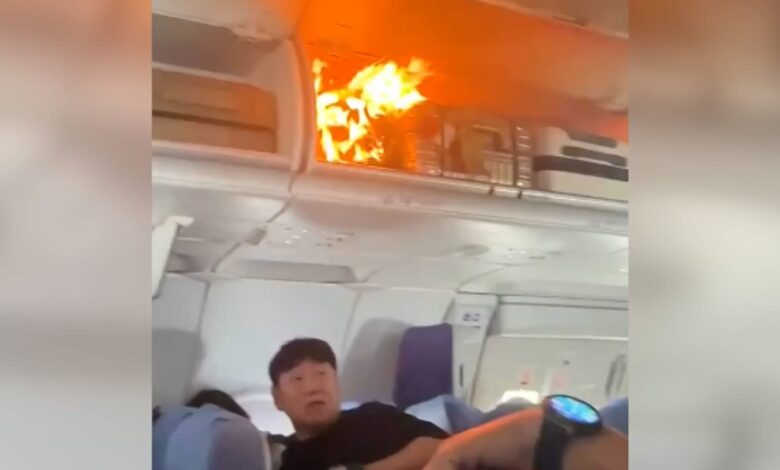 حريق بطائرة.. شاهد الهلع بعد احتراق بطارية “ليثيوم” فوق رؤوس الركاب