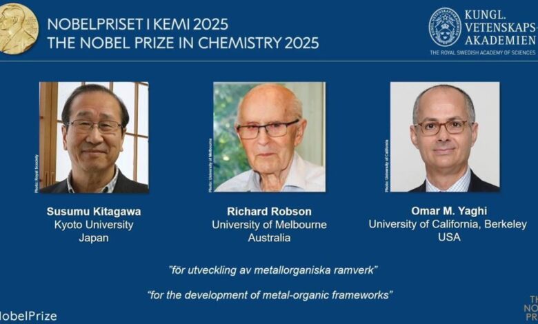 منح جائزة نوبل في الكيمياء يوم الأربعاء للعلماء سوسومو كيتاجاوا وريتشارد روبسون وعمر ياغي “لوضع أُطر معدنية – عضوية” أعلنت الهيئة التي تمنح الجوائز.