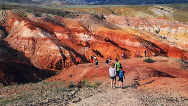 سياح في وادي كيزيل تشين في سهوب تشويا بجمهورية ألتاي. يُضفي ارتفاع نسبة الزئبق في الصخور لونًا أحمر.