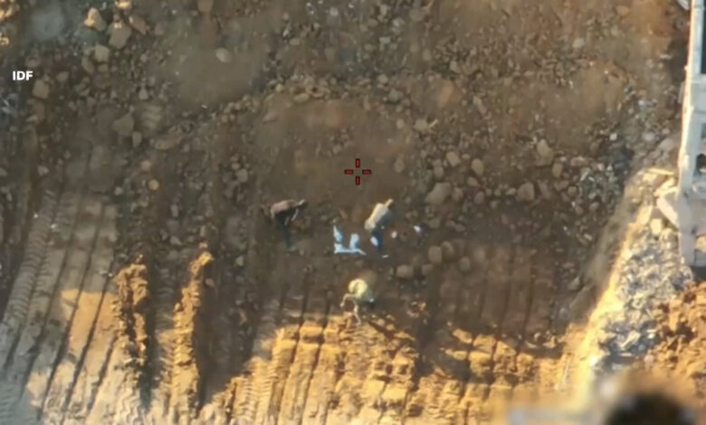 نشر الجيش الإسرائيلي، الثلاثاء، مقطع فيديو من طائرة بدون طيار، يُظهر على ما يبدو عناصر من حماس يدفنون كفنًا أبيض يحتوي على رفات رهائن في مدينة غزة، ثم يُظهرون عملية اكتشافه أمام الصليب الأحمر.