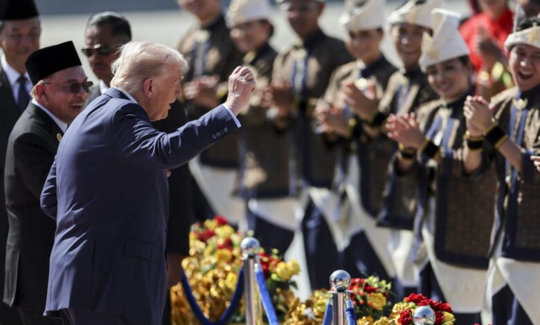 واستُقبل الرئيس الأمريكي استقبالًا حافلًا في كوالالمبور، حيث تجمع عشرات الضيوف والشخصيات، رافعين الأعلام الأمريكية والماليزية، بينما كانت طائرة الرئاسة تهبط في مكانها، ونزل ترامب الدرج ورحب به رئيس الوزراء الماليزي، أنور إبراهيم، بحرارة، ثم مر بحرس الشرف لتحية كبار المسؤولين.