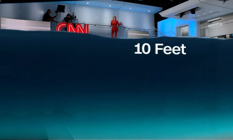 وفي هذا الفيديو، تستخدم مذيعة شبكة، كيت بولدوان عرضًا مرئيًا لتوضيح كيف يبدو ارتفاع مستوى المياه الناتج عن العاصفة بارتفاع 10 أقدام.