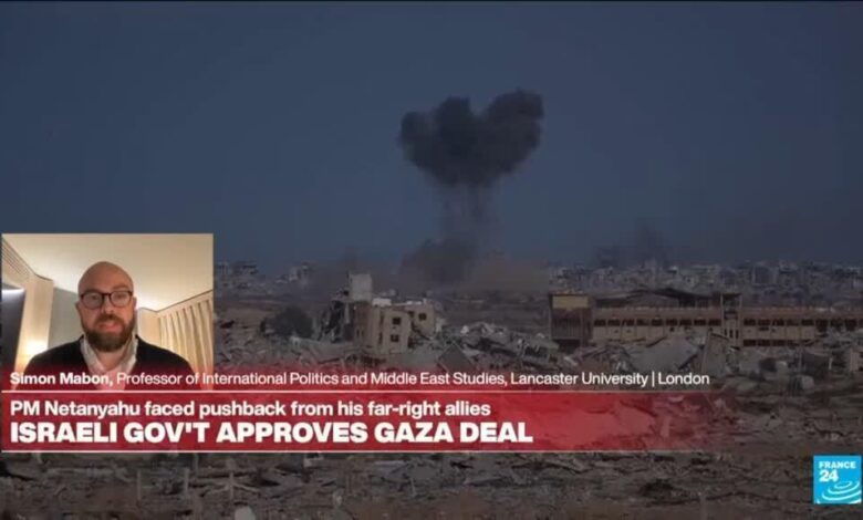 وترحب أليسون سارغنت بسايمون مابون، أستاذ دراسات السياسة الدولية والشرق الأوسط في جامعة لانكستر. ويعرب البروفيسور سيمون مابون عن ارتياحه وحذره في تقييم اتفاق وقف إطلاق النار الأخير في غزة. ,: , ,. غير أنه في الأجل الطويل، يشك في جدوى هيكل خارطة طريق للسلام وحل الدولتين. ويسود مشروع الخطة أوجه غموض بشأن نزع السلاح، وإدارة غزة، والدور النهائي للسلطة الفلسطينية. وليس هناك طريق واضح إلى الولاية ويؤكد أن شخصية دونالد ترامب وصلاته الدبلوماسية لعبت دورا حفازا، ولكنه يحذر من أن العقبات الهيكلية، والسياسة الإسرائيلية الداخلية، والمفسدين، والطموحات الإقليمية المتنافسة ستختبر ما إذا كانت هذه الهدنة الهشة تشكل أساسا لأي نوع من النظام الدائم.