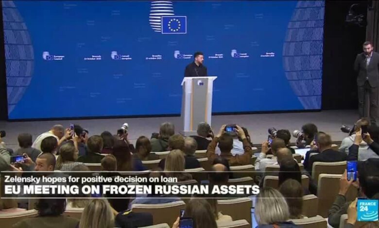 الرئيس فولوديمير وقال زيلنسكي إنه ينبغي السماح لأوكرانيا باستخدام أصول روسية مجمدة لتمويل إنتاج الأسلحة المحلية وشراء الأسلحة من أوروبا والولايات المتحدة، متحدثا في مؤتمر صحفي عقد في بروكسل، وحث الاتحاد الأوروبي على الموافقة على ” قرض إصلاح ” رئيسي تدعمه تلك الأصول، وقال إنه يأمل في اتخاذ قرار سياسي إيجابي قريبا. ” وجلب روسيا الحرب إلى أرضنا، ويجب عليهم أن يدفعوا ثمنها “. (فرنسا24) موقّع الشؤون الدولية (دوغلاس هيربرت) يشرح ما هو على المحك.